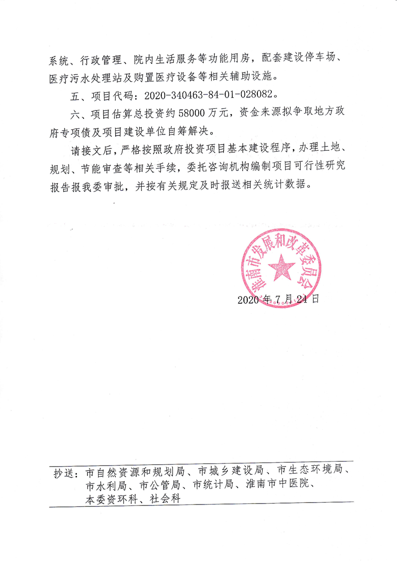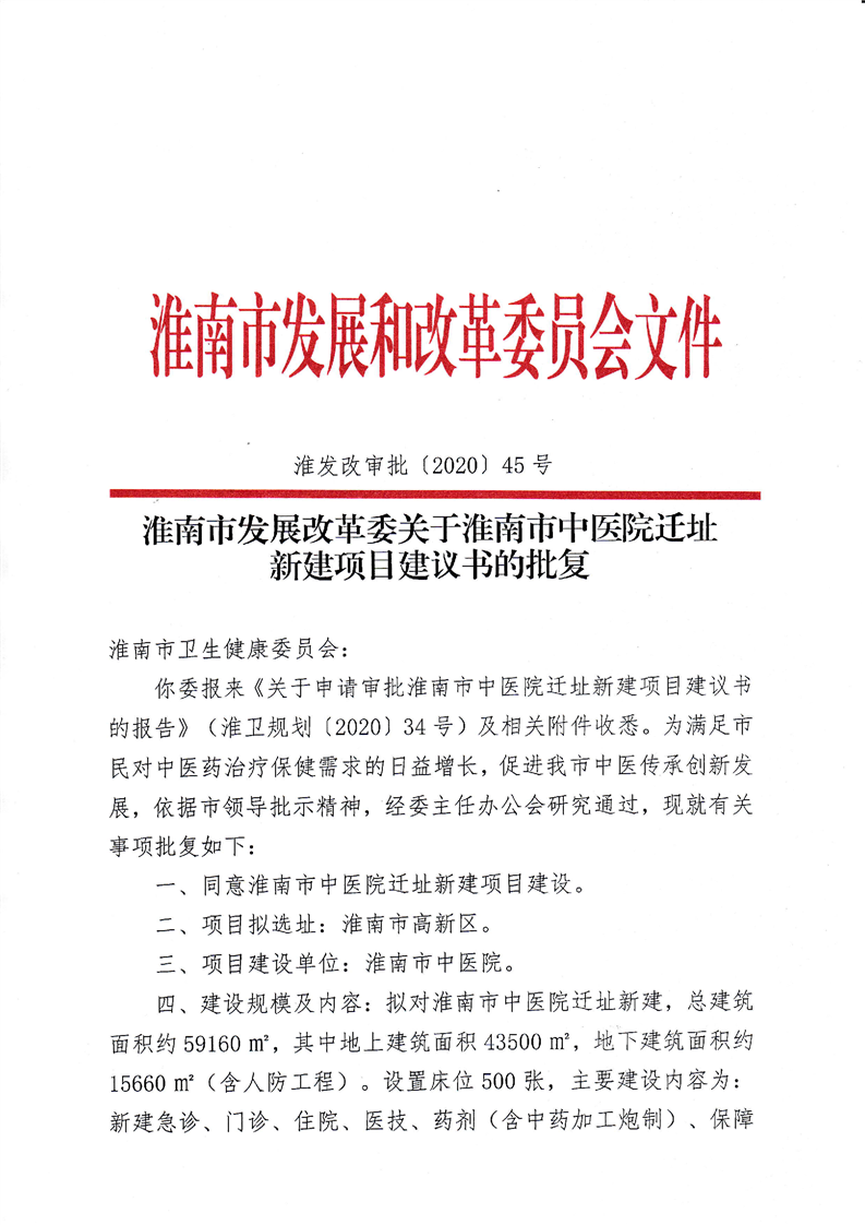 【建议书审批】淮南市发展改革委关于淮南市中医院迁址新建项目建议书的批复