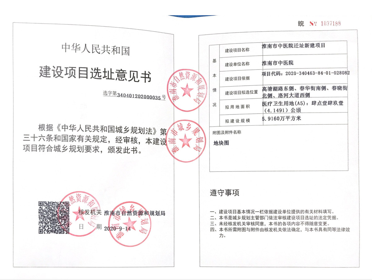 【选址意见书】淮南市中医院迁址新建项目选址意见书