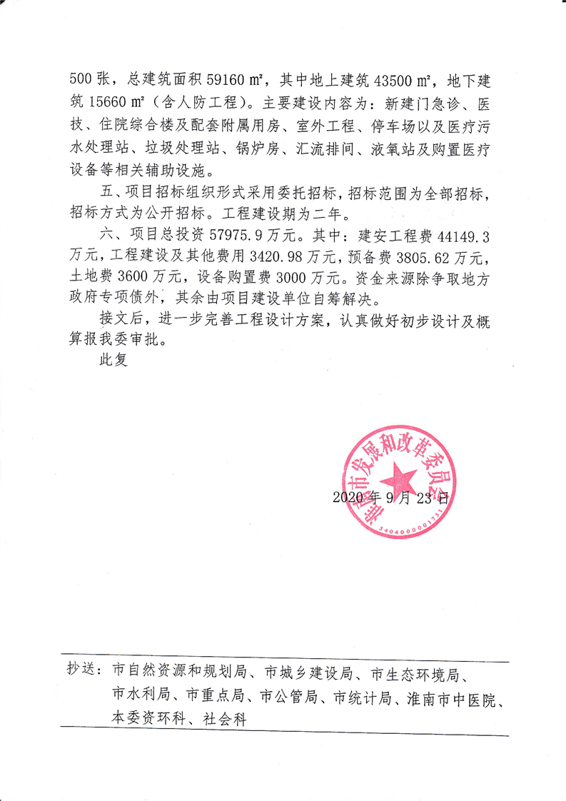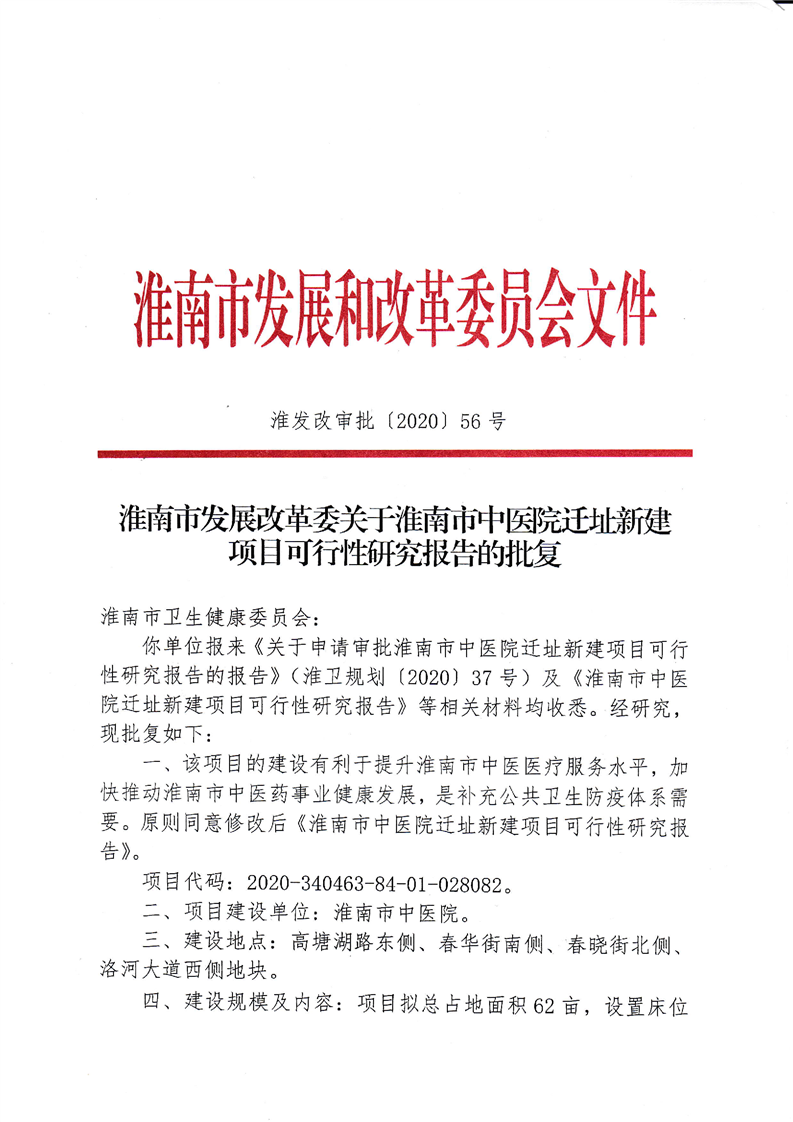 【可行性研究报告审批】淮南市发展改革委关于淮南市中医院迁址新建项目可行性研究报告的批复