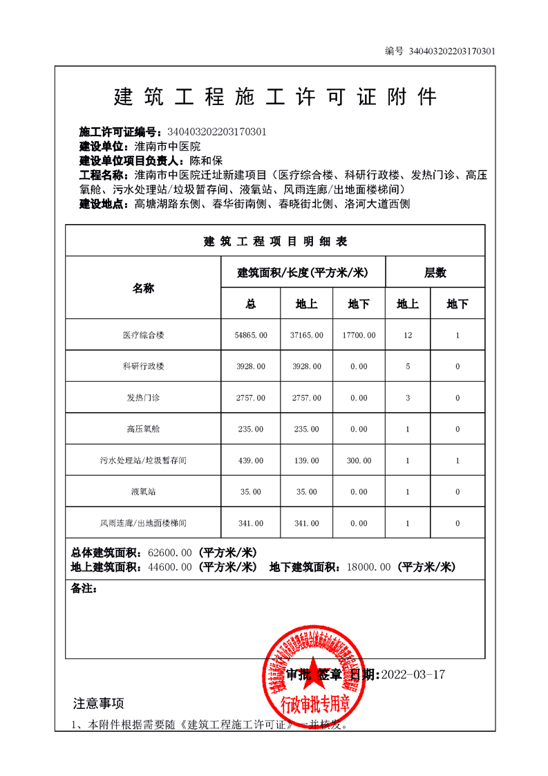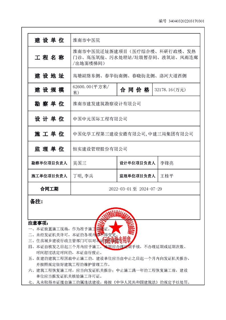【施工许可证】淮南市中医院迁址新建项目施工许可证