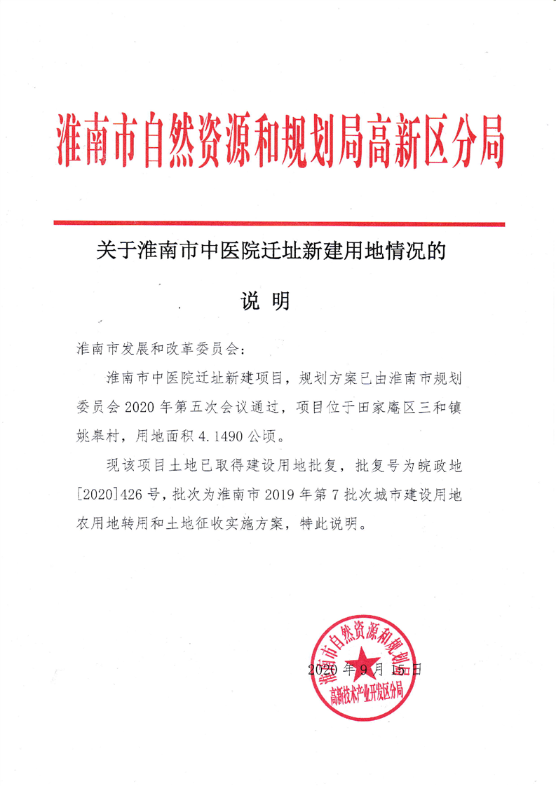 关于淮南市中医院迁址新建用地情况的说明