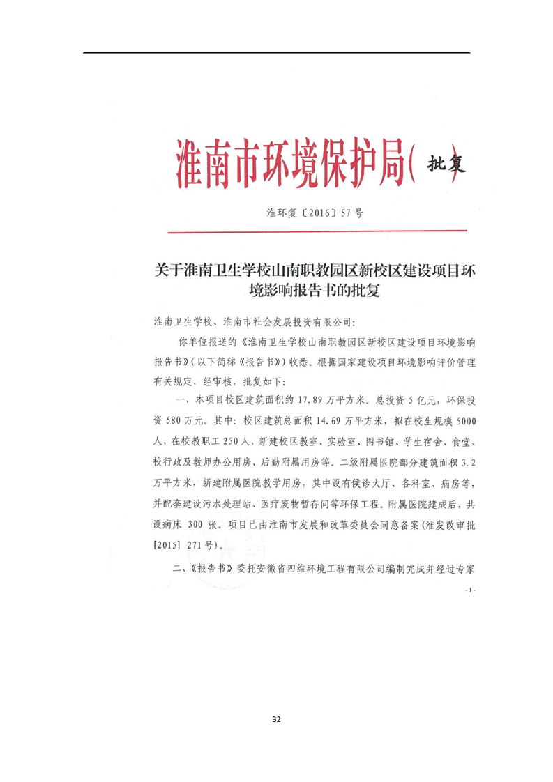 【环境影响评价审批】关于淮南卫生学校山南职教园区新校区建设项目环境影响报告书的批复