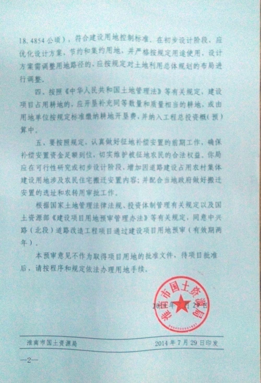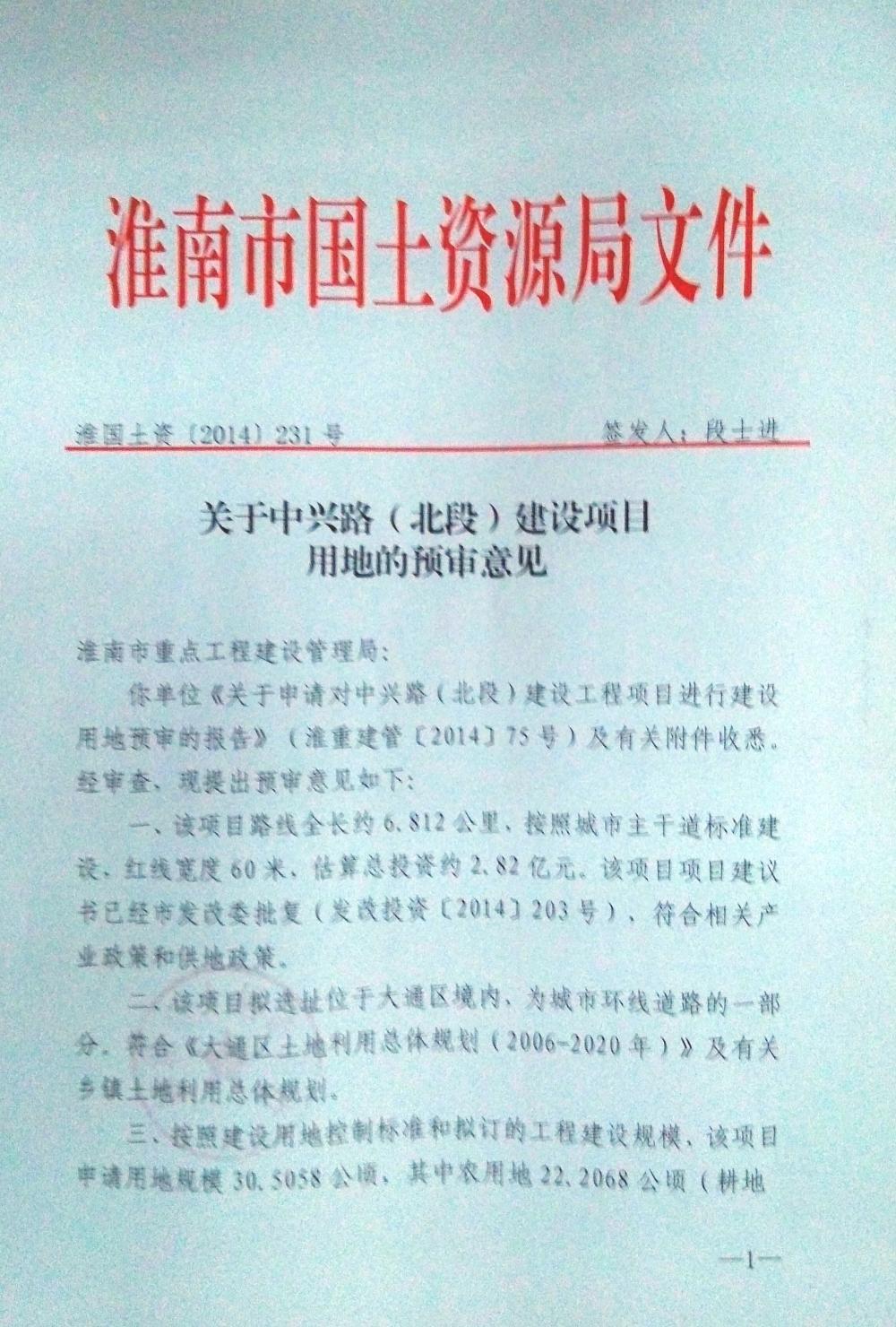 【建设项目用地预审】关于中兴路(北段)建设项目用地的预审意见