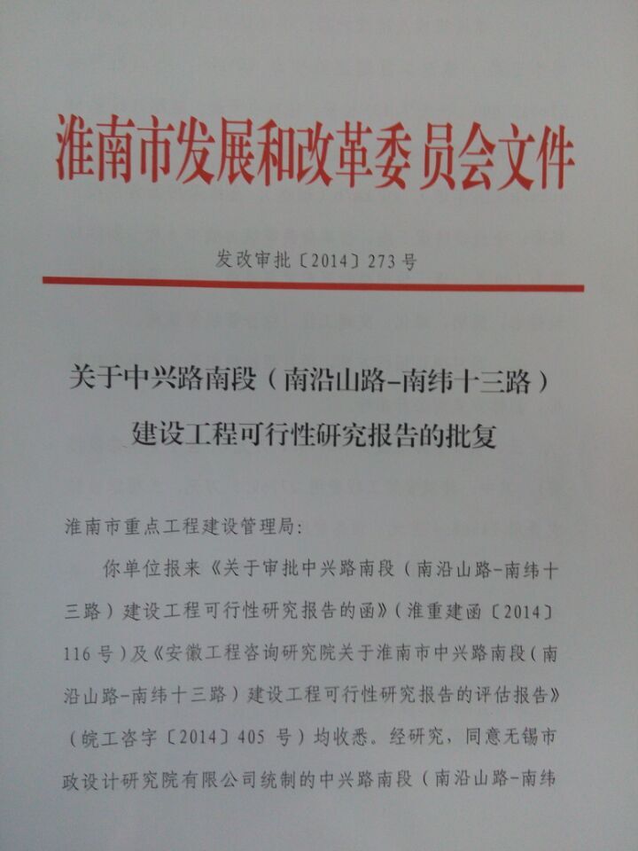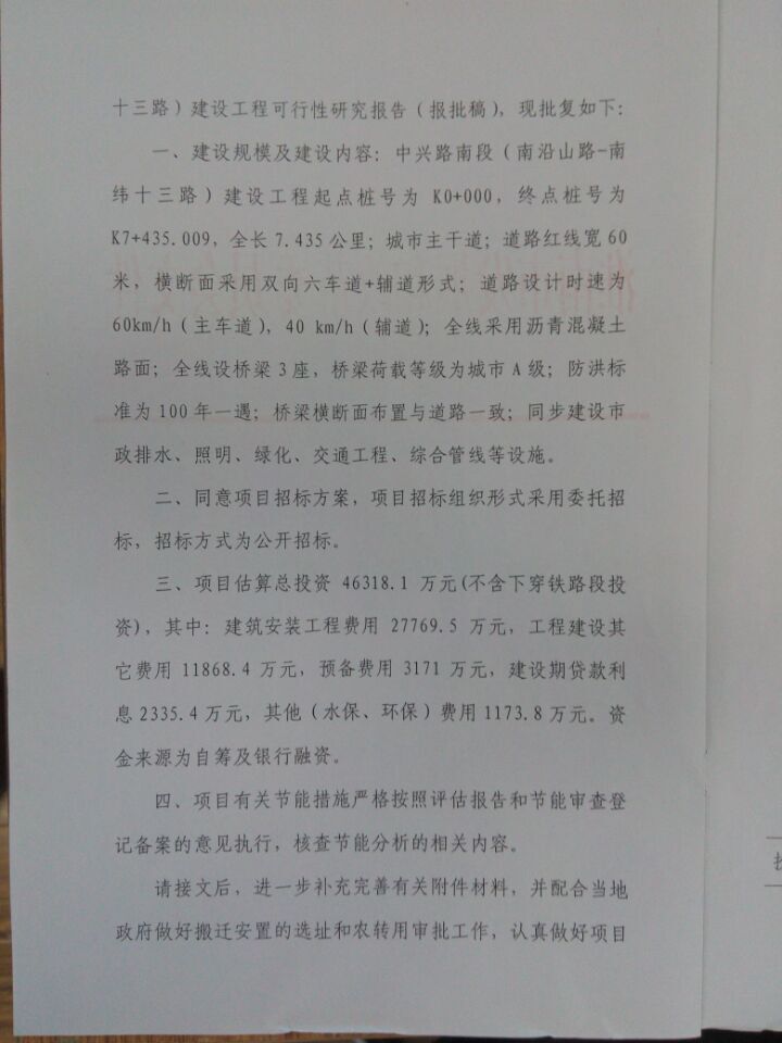 【可行性研究报告审批】关于中兴南段(南沿山路-南纬十三路)建设工程可行性研究报告的批复