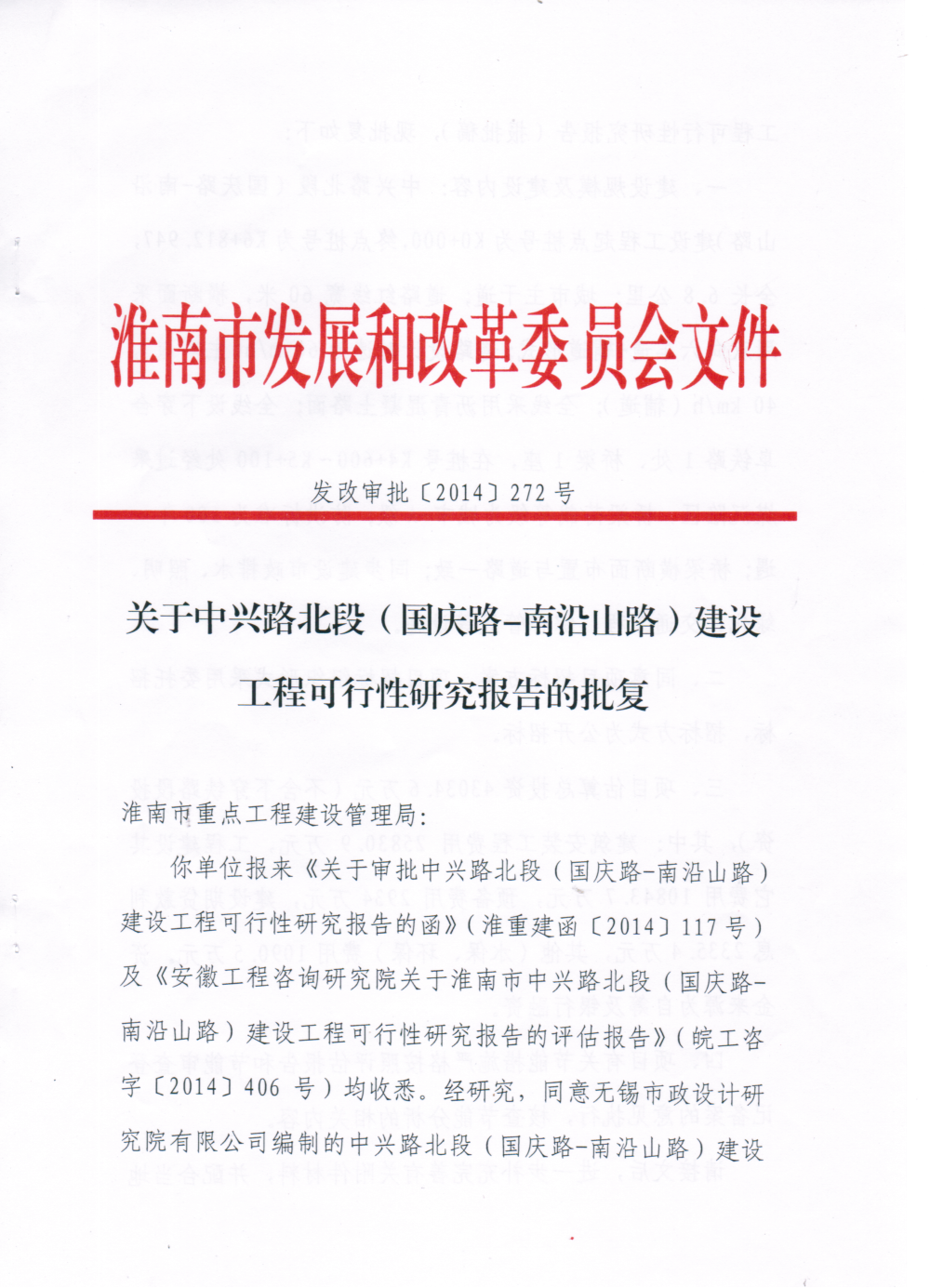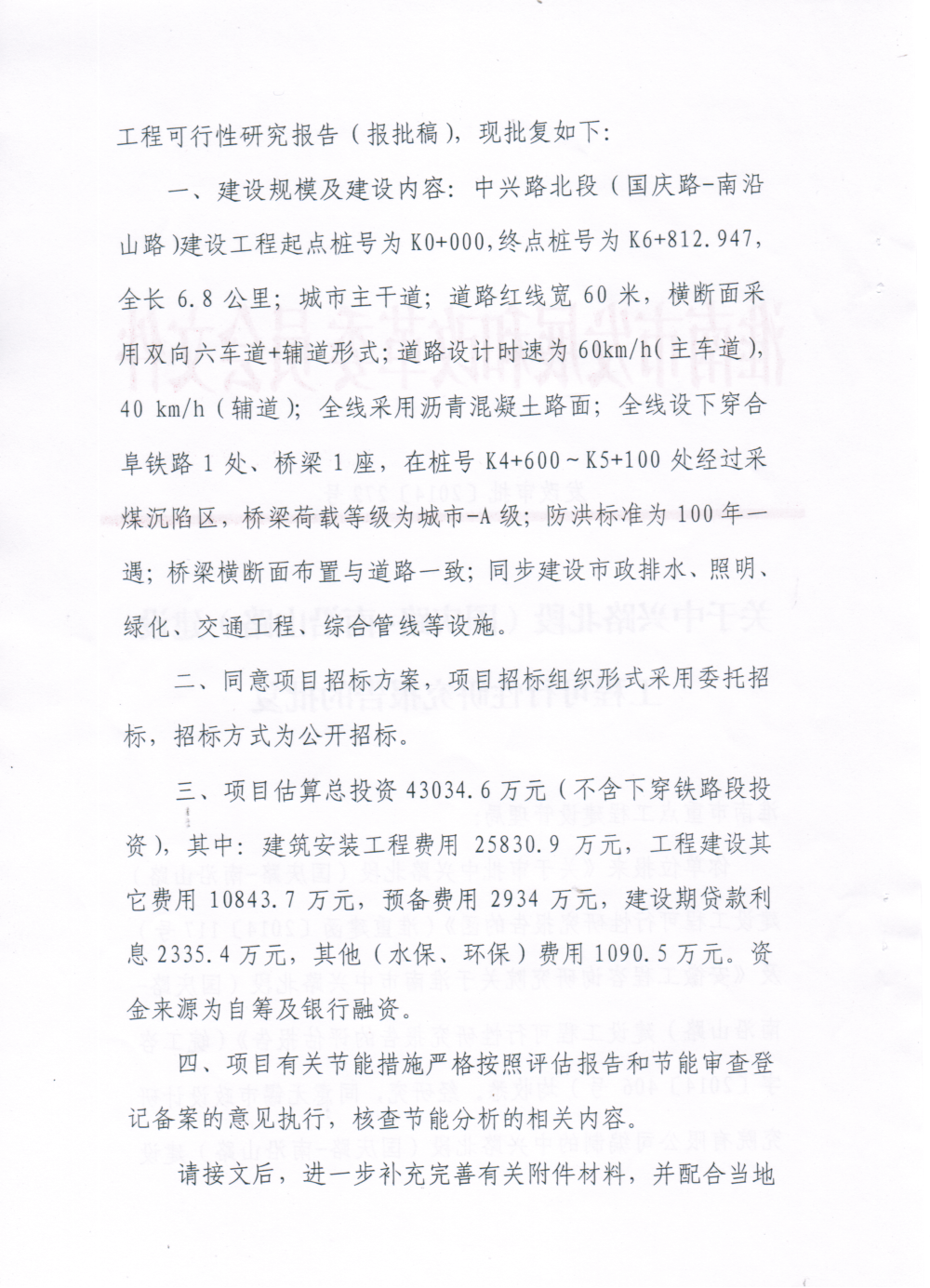 【可行性研究报告审批】关于中兴路北段(国庆路-南沿山路)建设工程可行性研究报告的批复