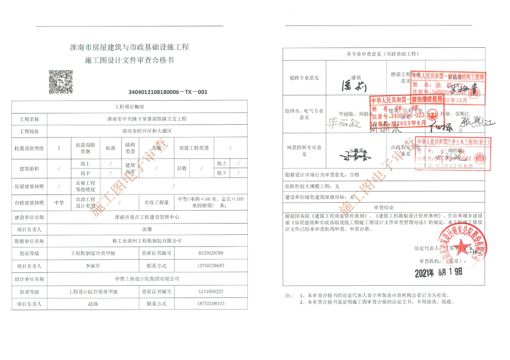 中兴路下穿淮南铁路立交工程市政审查合格书