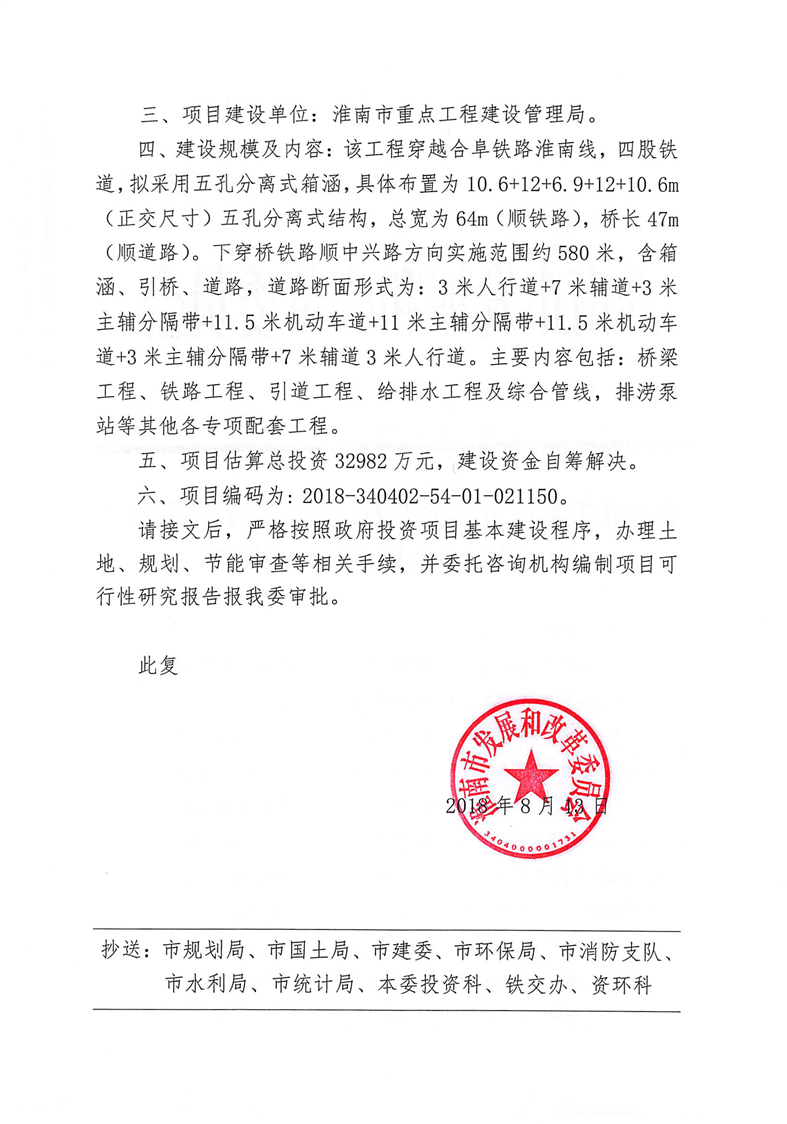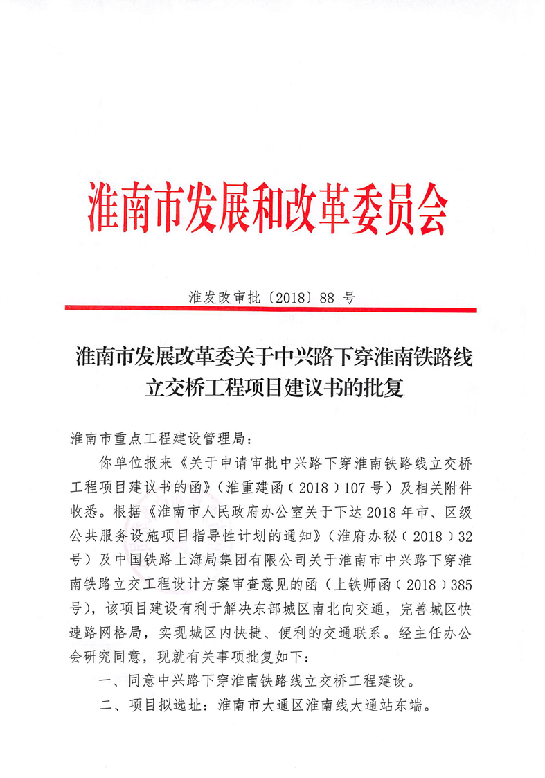 【建议书审批】淮南市发展改革委关于中兴路下穿淮南铁路线立交桥工程项目建议书的批复