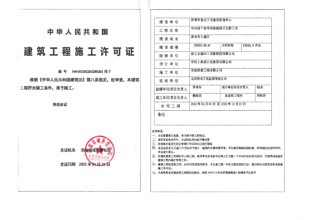 【施工许可证】中兴路下穿淮南铁路立交工程施工许可证