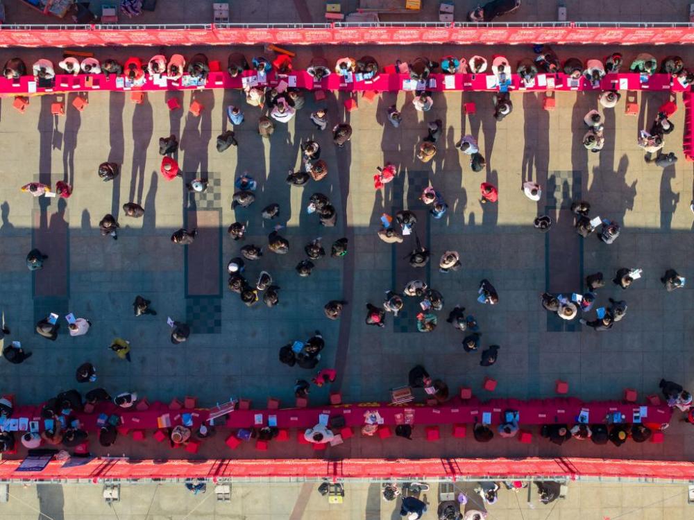 2025年1月15日,求职者在招聘会现场了解招聘信息(无人机照片)。新华社发(阮雪枫摄)